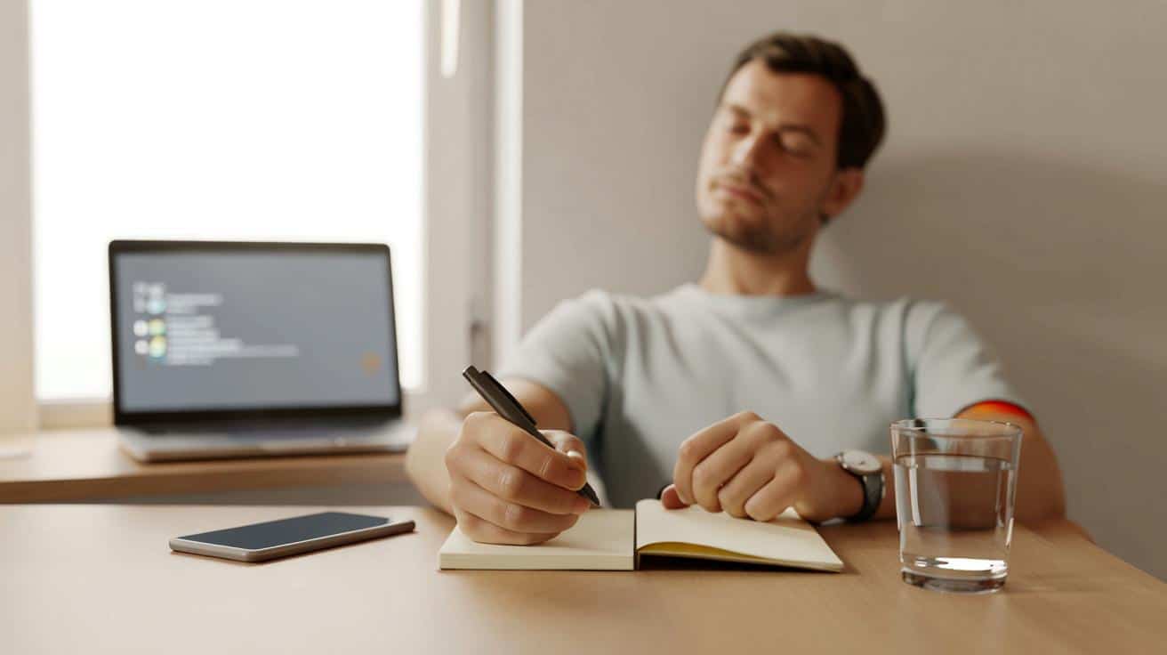 Klingt lächerlich simpel. Aber genau diese Kombination aus Aufschreiben + Körper in den Fokus holen wirkt wie ein kleiner Neustart-Knopf im Kopf. Das Gehirn bekommt ein Signal: Jetzt ist eine Grenze. Jetzt ordnen wir. Jetzt fahren wir einen Gang runter.